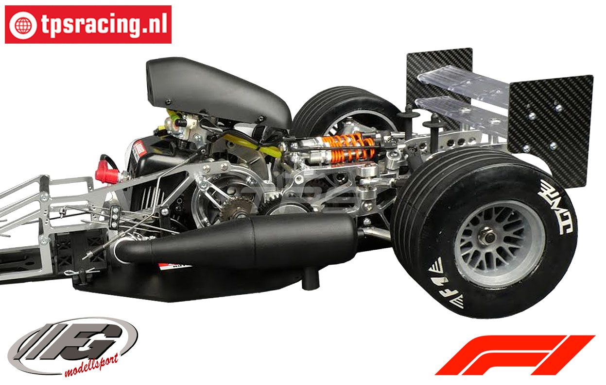 Die Vorder- und Hinterachse bieten viele Einstellmöglichkeiten, wie z. B. Vorspur, Sturz, Camber und Fahrhöhe. Das Viskose-Differential und der Kugelantrieb sorgen für eine stabile Übertragung nach die Räder. Die vier ölgefüllten, einstellbaren Stoßdämpfer und die Vollstabilisatoren runden das Paket ab. Dieser Formel-1 Competition ist mit Scheibenbremsen vorne und hinten ausgestattet. Der Antrieb erfolgt über einen Zenoah 26 ccm Motor mit Zeilzugstarter. Ein ausgewogener Tuning-Auspuff sorgt für maximale Leistung.